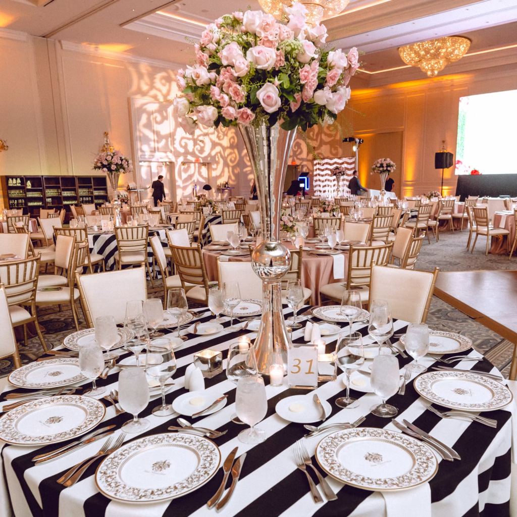 Pink Velluto Lines, White Napkins, Gold Chargers